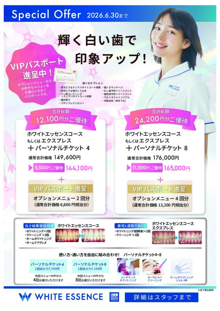 2026年6月30日までの期間限定で、ホワイトニングとクリーニングを自由に組み合わせられる「パーソナルチケット」と、本格的な「ホワイトエッセンスコース」をセットにした特別プランをご用意しました。
