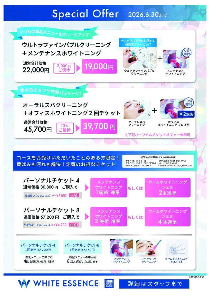 これまでにホワイトエッセンスのコース(ホワイトエッセンスコース、オフィスホワイトニング2回チケットなど)をお受けいただいたことのある方へ、特別なオファーをご用意しました 。