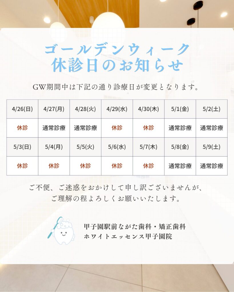 ゴールデンウィーク期間中の休診日のお知らせ 医院からのお知らせ 2026.04.26 Facebook X LINE ブログに診療カレンダーを追加しました!ブログの内容は↓↓↓↓↓↓↓↓https://www.smile-nagata.com/blog/1653/ Facebook X LINE
